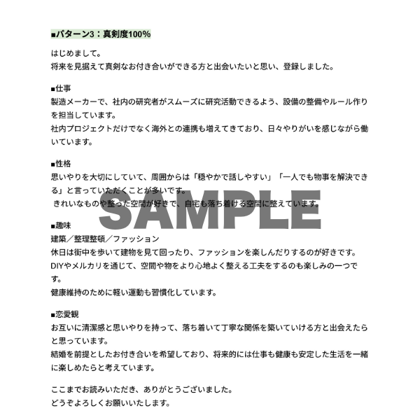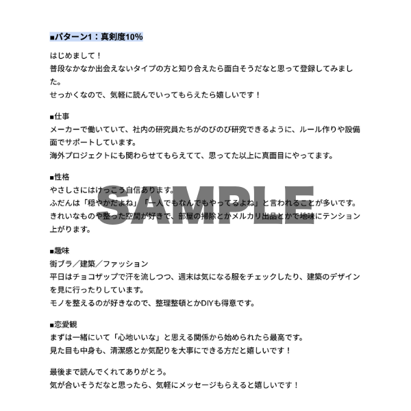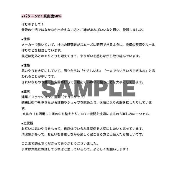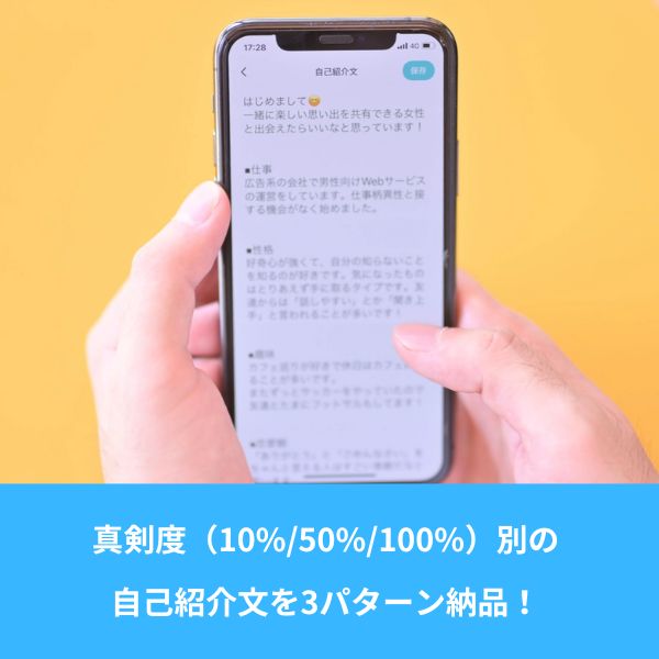 マッチングアプリに詳しいスタッフが、真剣度(10%/50%/100%)別の自己紹介文を3パターン納品します!