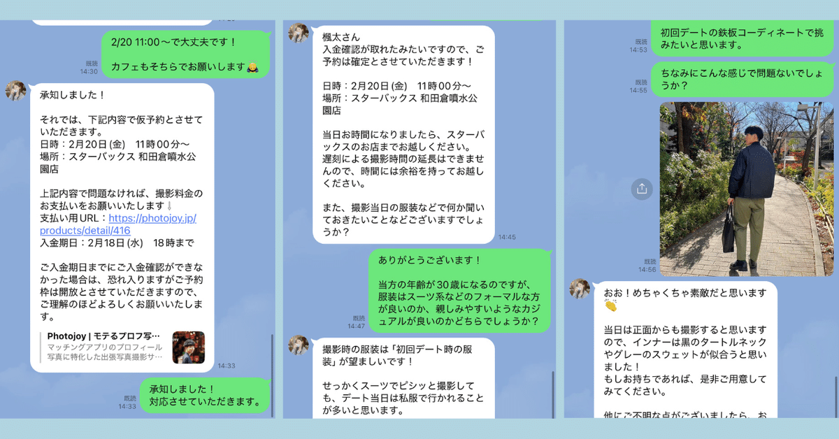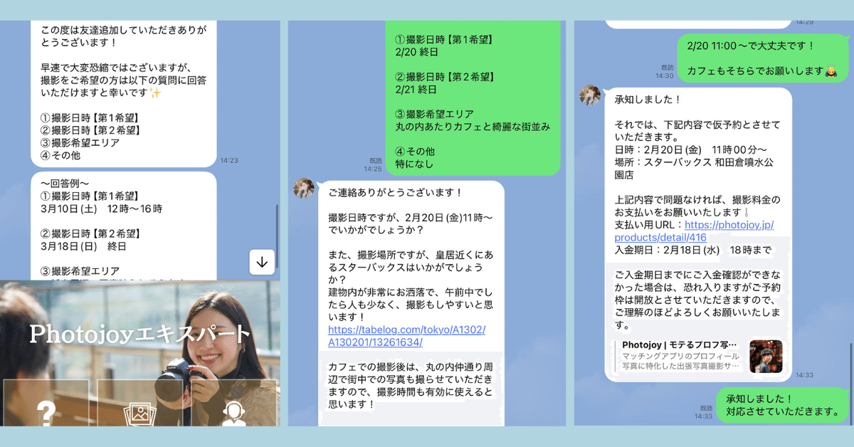 Photojoyエキスパートでは、撮影前日まで担当カメラマンにLINEで相談することが可能です。